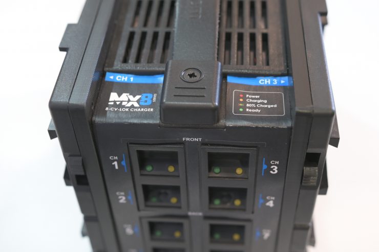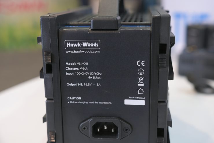 The Hawk Woods eight channel mini V-lok charger is designed to fit the company’s small V-mount batteries and to charge eight of them ‘semi-simultaneously.’