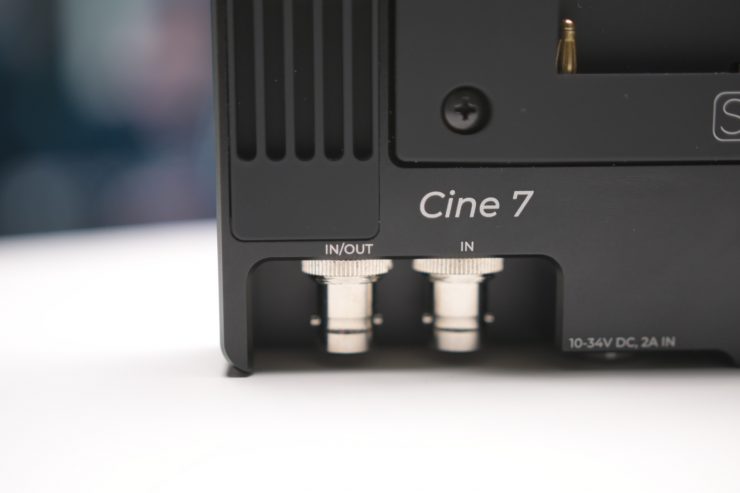 On the bottom of the Cine 7 you will find recessed SDI IN and SDI IN/OUT ports, the HDMI IN and HDMI IN/OUT ports, the ethernet port, and the 2 pin Lemo power input. The Cine 7 does cross conversion between SDI and HDMI and HDMI and SDI.