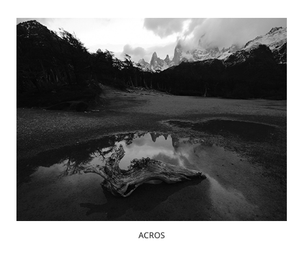 - ACROS: Premium monochrome mode delivers fine texture, deep blacks and smoother tones.