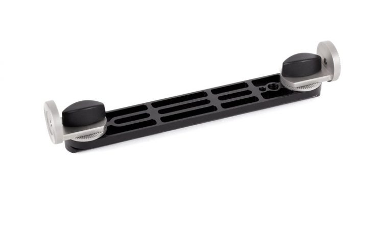 The Crossbar uses an integrated NATO standard rail to be adjusted left & right to get the correct balance for the camera. It also has tapped holes to mount other accessories like an articulating arm. Each end has a safety pin to prevent the Crossbar from sliding out accidentally.