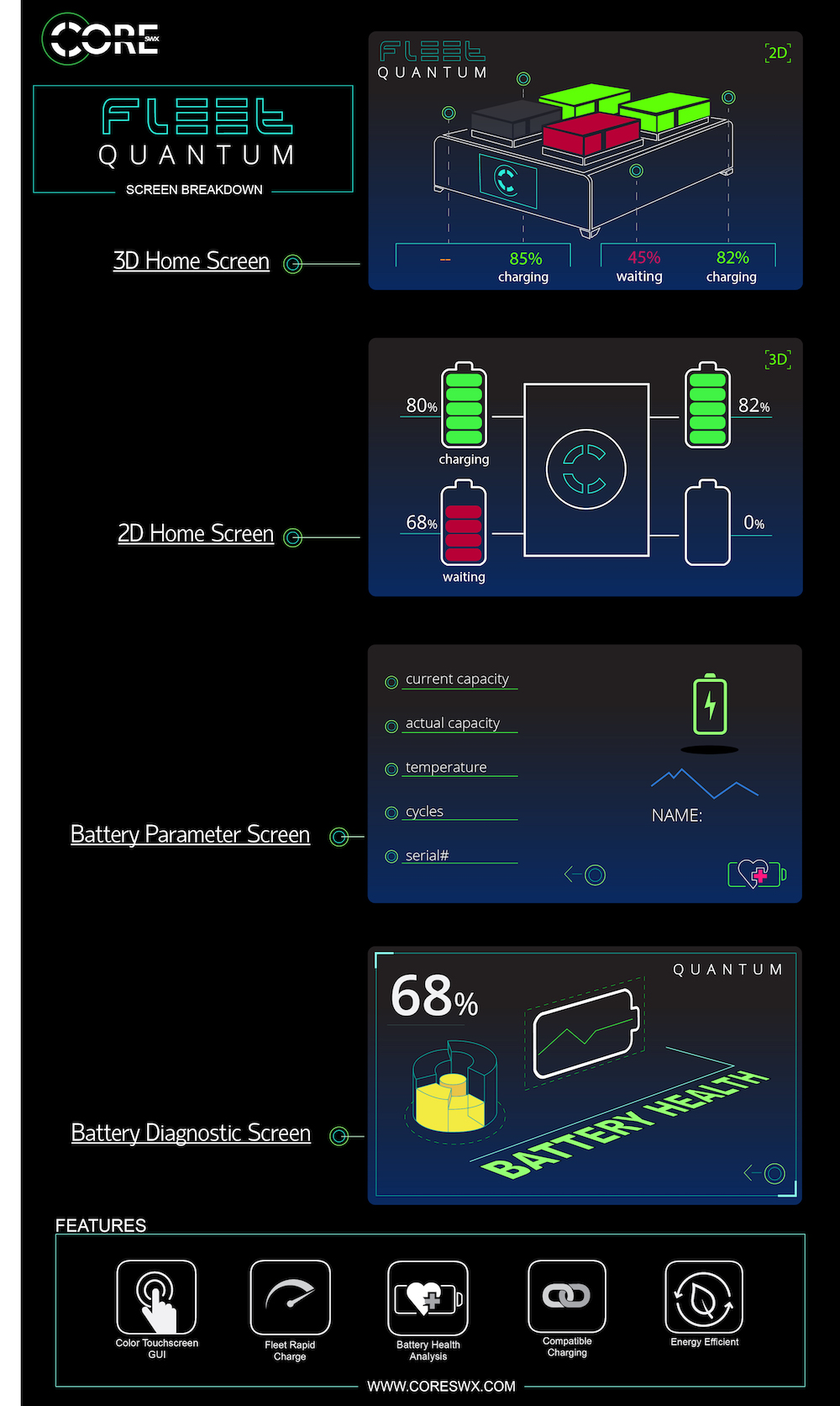 Something unique to the Fleet Quantum which I haven’t seen before in a quad charger is a large color touchscreen LCD with a graphical user interface that provides stored smart battery data including state of charge, cycle count, capacity data and more. The Fleet Quantum quad charger will be available in November for $879 US.