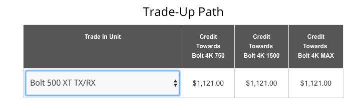 If you are thinking of upgrading to the new 4K Bolt you can trade an existing Bolt product in much the same way you would trade in a used car to get a discount on a new one. This offer ends on October 31st, 2019.