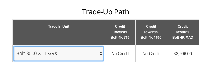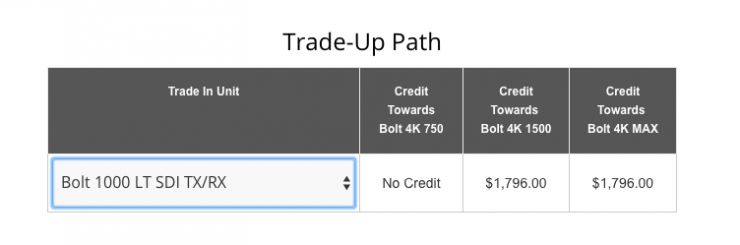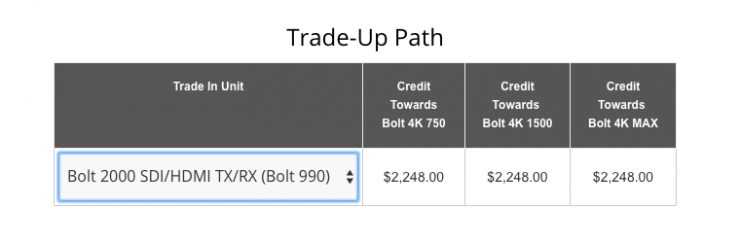 The Teradek Bolt 4K Upgrade Program allows customers to trade-in eligible Bolt products for credit toward the new Bolt 4K.