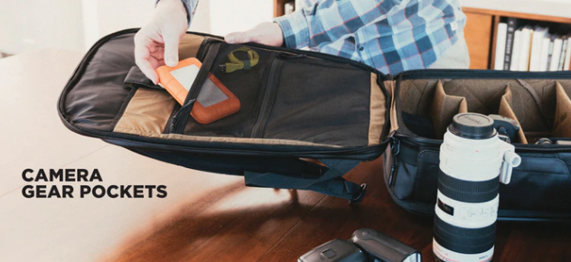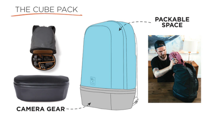 The bag also comes with a cube pack made from durable materials that fits in the camera bag. This can be used to store a camera or drone, or it can also be converted into a small backpack.