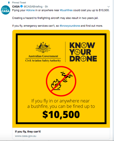 Australia is experiencing very bad bushfires and CASA, the Australian Civil Aviation Safety Authority has taken to Twitter to remind users of drones to stay away or otherwise be heavily fined or/and face jail time.