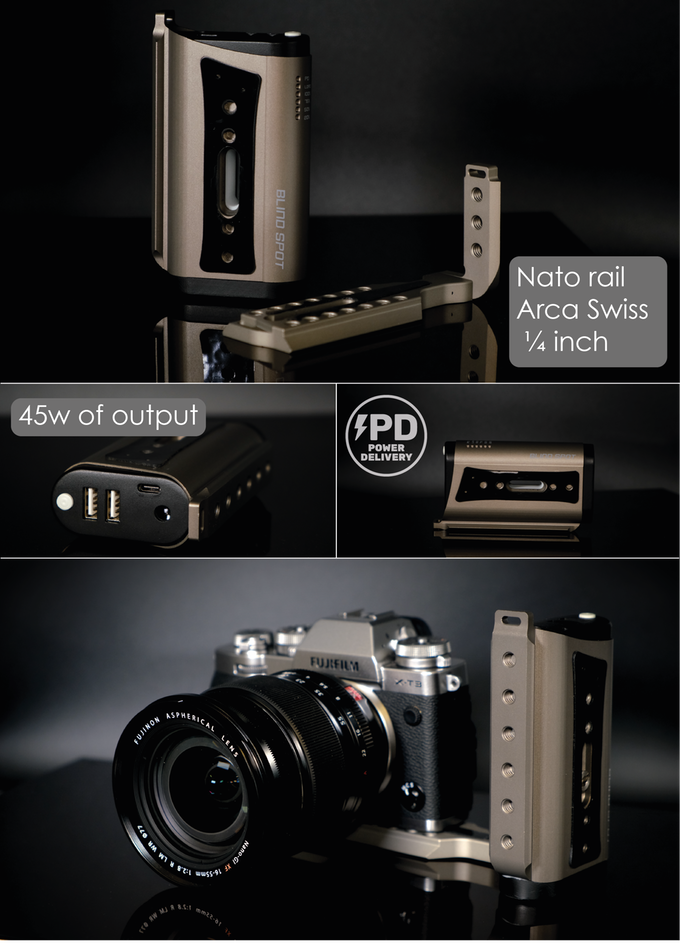 The Power Cage can also be used standalone as a regular power bank. As well as 1/4″ mounts to attach accessories to the Power Cage, a through-hole so you can attach cameras and other accessories directly onto the power cage with the right screws.