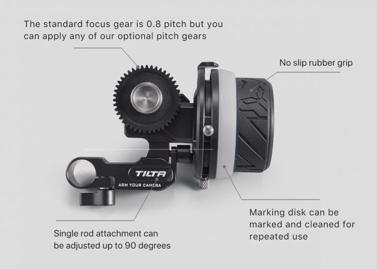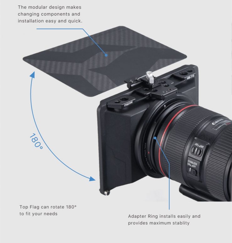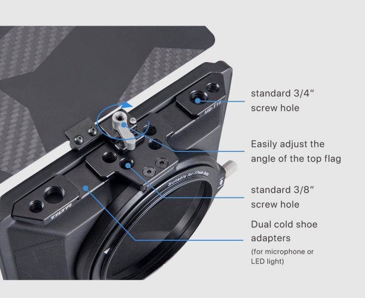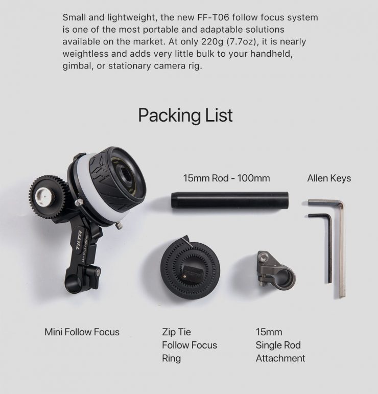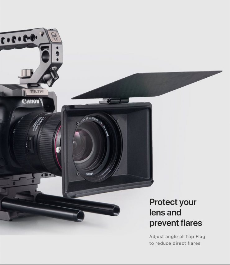 Made for use with DSLRs and Mirrorless cameras and lenses, the Tiltaing Mini Matte Box features a super light-weight design that can accomodate screw-on or 4″x5.65″ filters. You can pair pair it with the FF-T06 Mini Follow Focus and a Tiltaing camera cage.