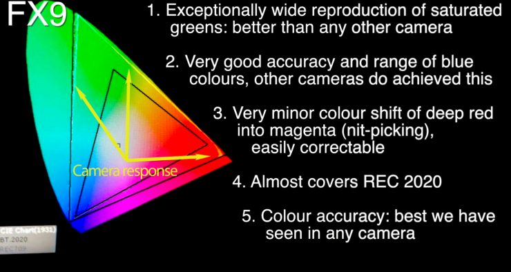 This is a very technical test, but it has the ability to map the color gamut that a sensor is producing. What was quite a shock, was that not only did the FX9 outperform the FS7 M2 by a considerable mar gain, but it also produced the best result of any digital cinema camera that has been tested. This includes most of the top tier cinema cameras that are on the market today.
