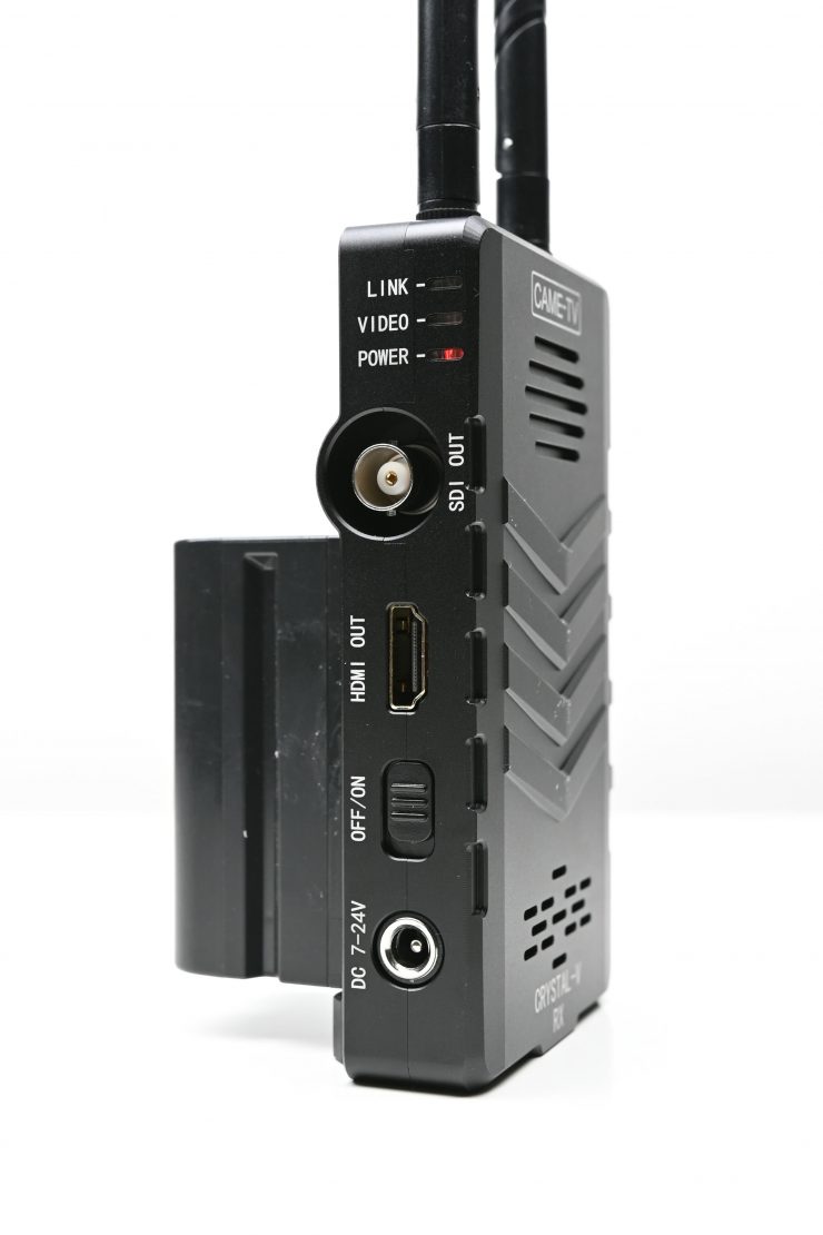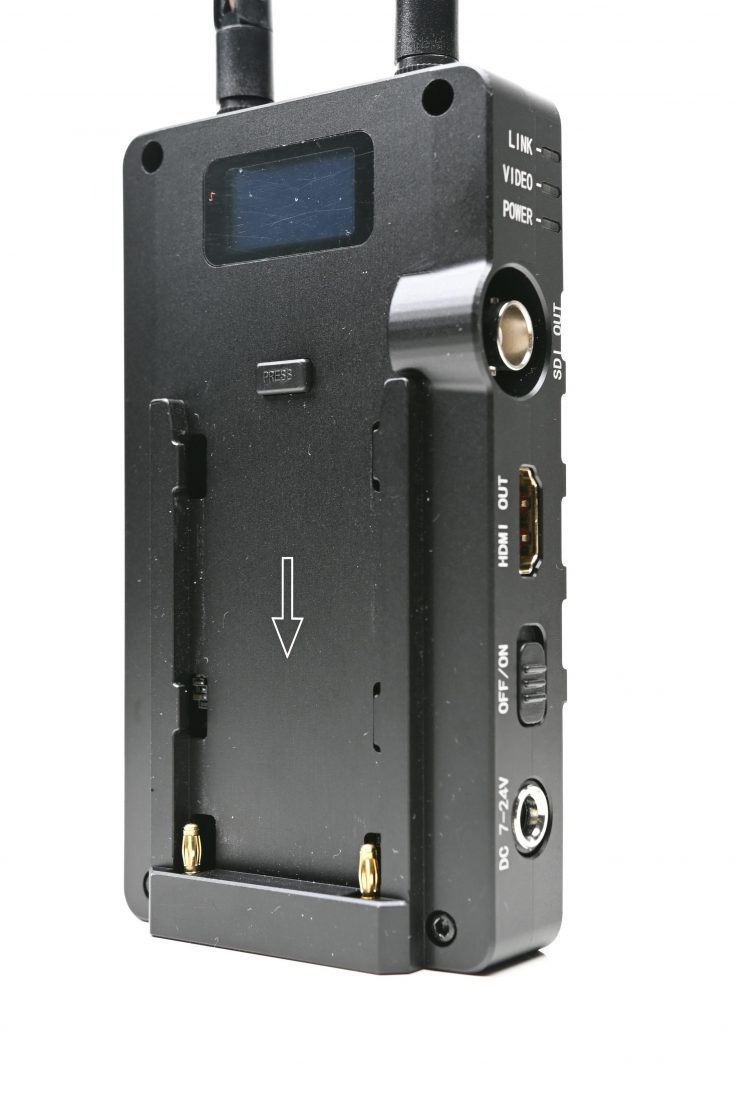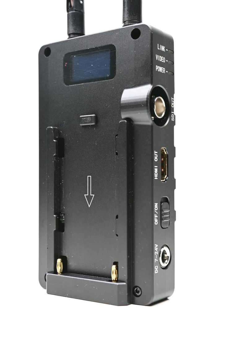 The RX unit is powered by a built-in Sony NP battery plate. It can also accept a DC 7-24V input.