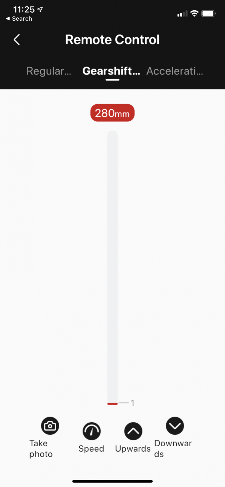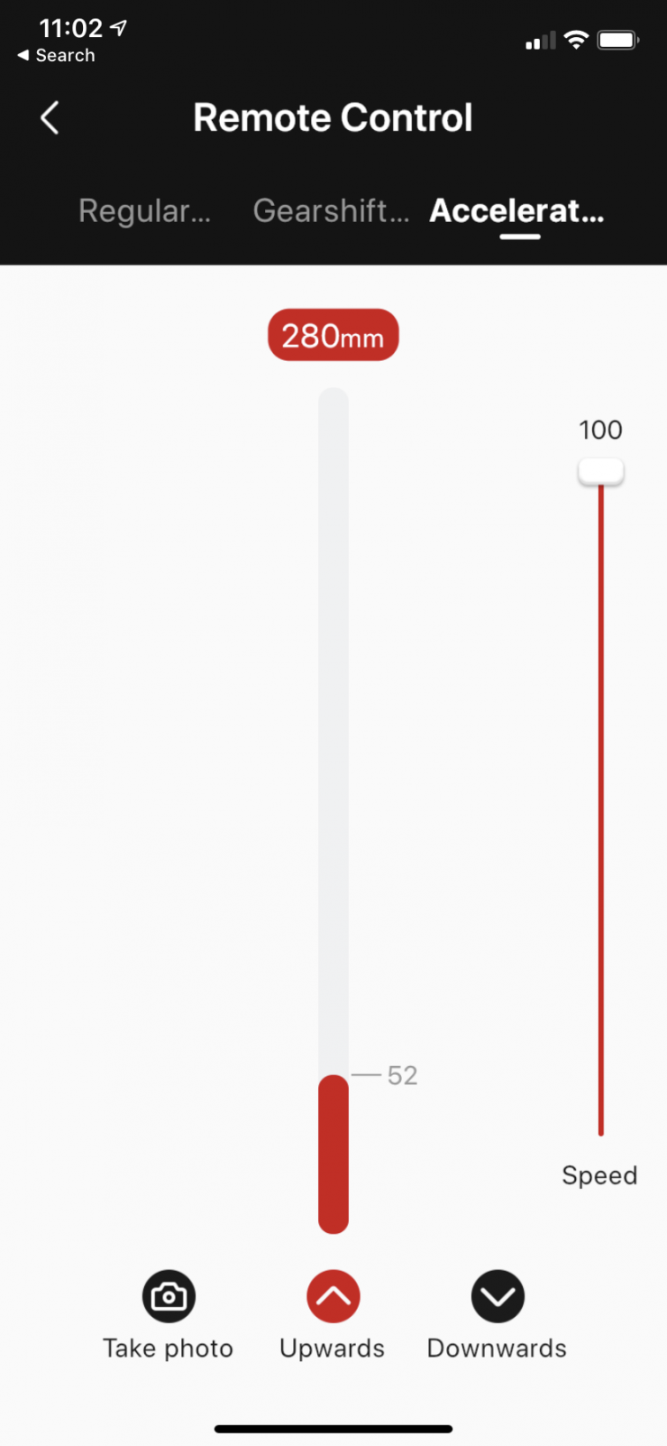 The third option is the Acceleration Mode. By dragging the white mark to set the device acceleration speed, and the device will continue to accelerate to the end position according to the set speed. When the Slypod extends to 280mm or retracts to 0mm it will reach the set speed that was set.