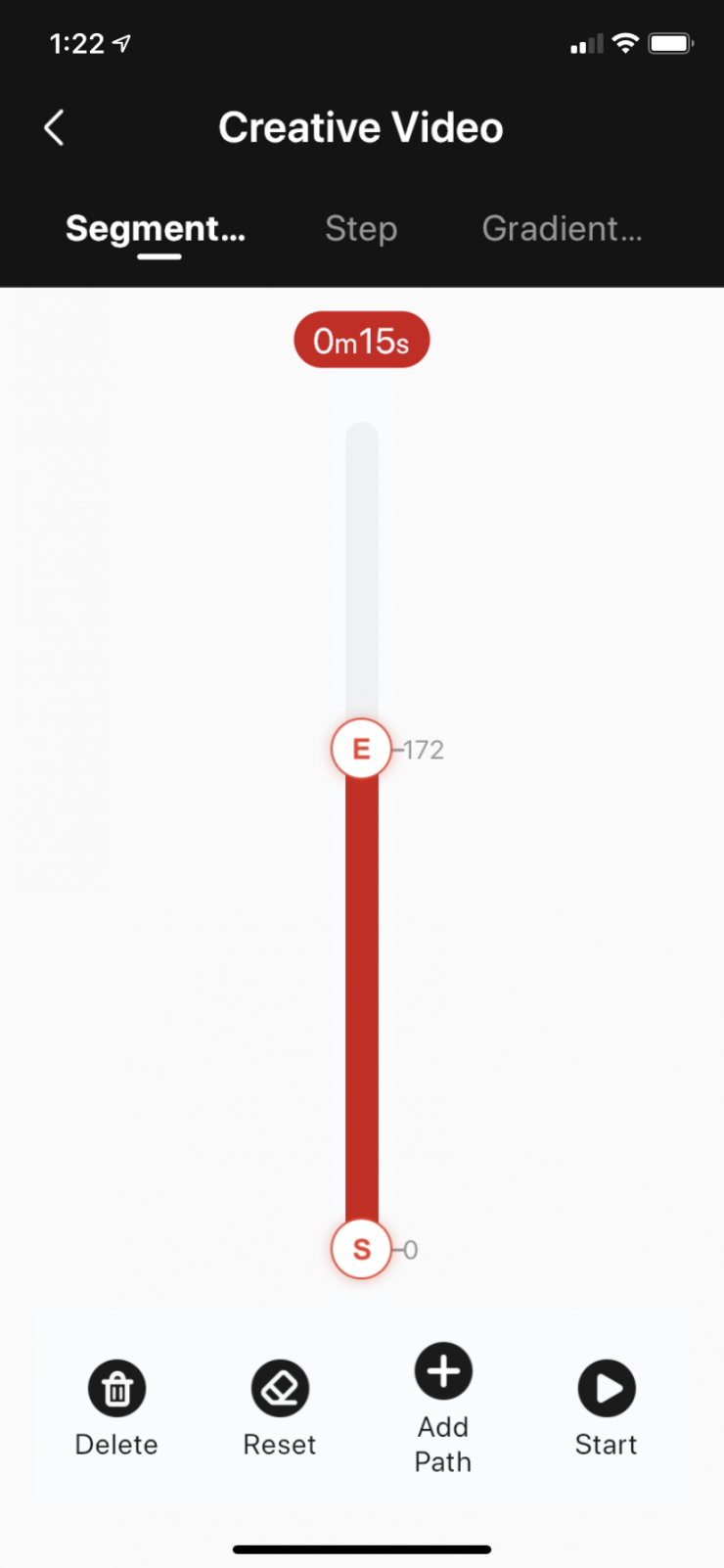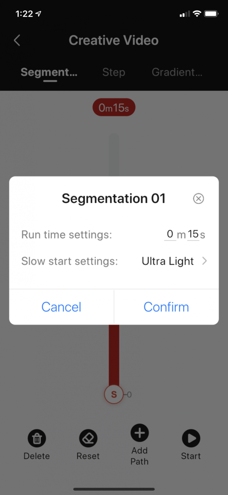 By tapping on the time indicator at the top of the range, you get a dialogue widow to set how long the move will be and how slow the camera move will start. If you intend to us the beginning of the shot, an Ultra Light setting is pretty smooth. If you want to just get it going as fast as possible, choose Heavy.