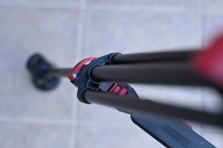 Because of the design of the locks on the tripod legs, you do need to shift the tripod further back when it is on your shoulder and you are carrying it. If you don’t do this, the locking mechanisms dig into your shoulder.