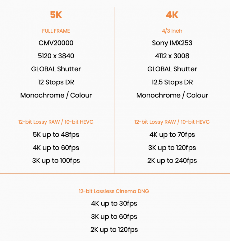 The sensors we’re aiming to support at the moment are 1.1-inch (4K) and Full frame (5K). Both of these are global shutter with color and monochrome variants. The dynamic range falls between 12 and 13 stops.