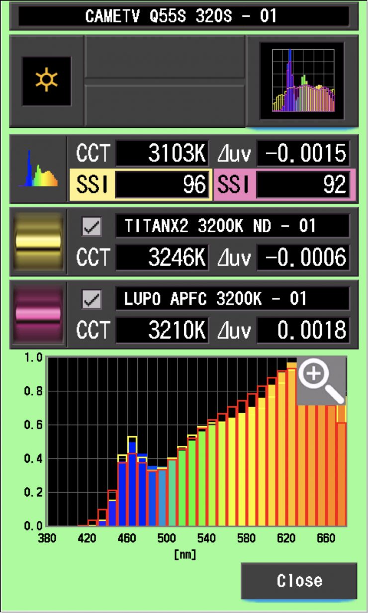 SSI (Spectral Similarity Index) was developed by the Sci-Tech Council of the Academy. SSI gives me the ability to set any light as a standard, or use predefined standards (such as CIE D55), and then give other lights an SSI score based upon how well they will match standards such as CIE D55 measure spectral response and compare it directly against an ideal light source.