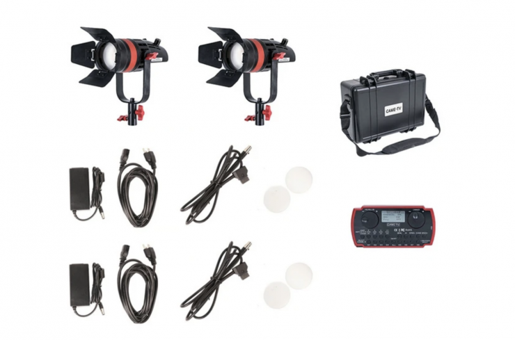The CAME-TV Q-55S Boltzen Fresnel Kit consists of two Boltzen 55W high output LED lights, a remote Wifi controller, filters, power adapters, and a hard case.