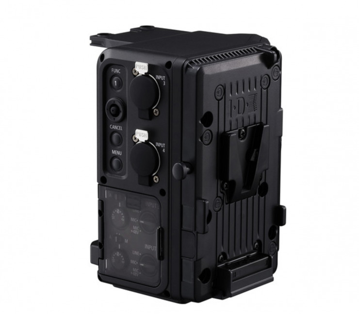 The EU-V2 (Expansion Unit) costs $1,600 USD. It features a V-lock or AB battery plate and gives you two additional audio inputs (more on the audio later). This enables you to record four separate audio tracks.