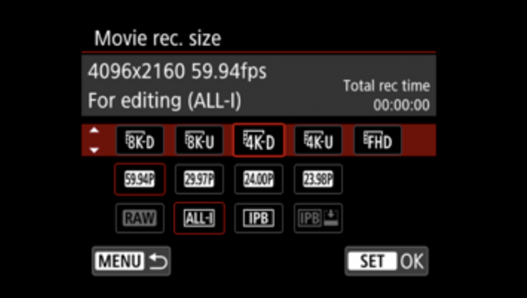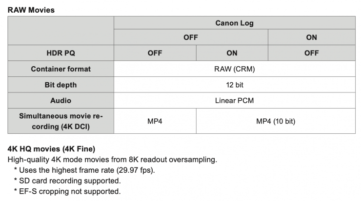 | 8K DCI | Canon RAW 12-bit & 4:2:2 10-bit | Canon RAW & ALL-I/IPB H.265 | 23.98fps, 24fps, 25fps, 29.98fps | 20min | |
