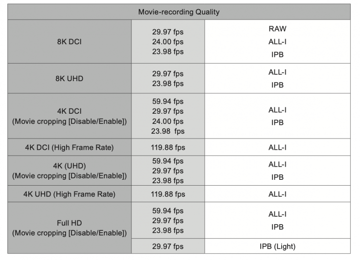 8K movie recording (RAW, DCI, UHD) has restrictions on possible recording time due to the temperature rise. Max possible recording time is approx. 20 min. (at room temperature).