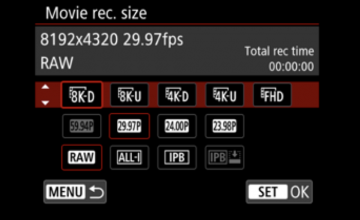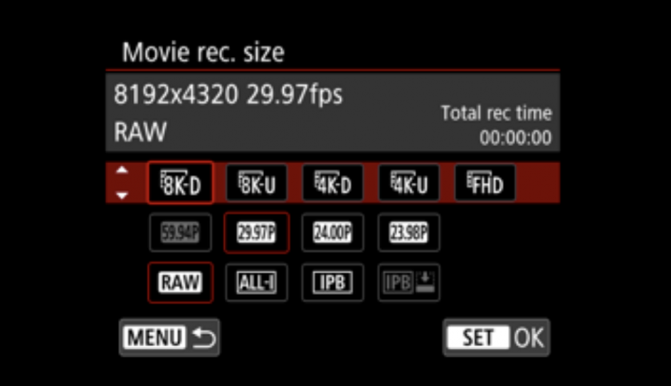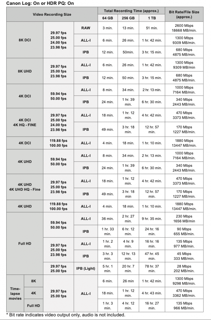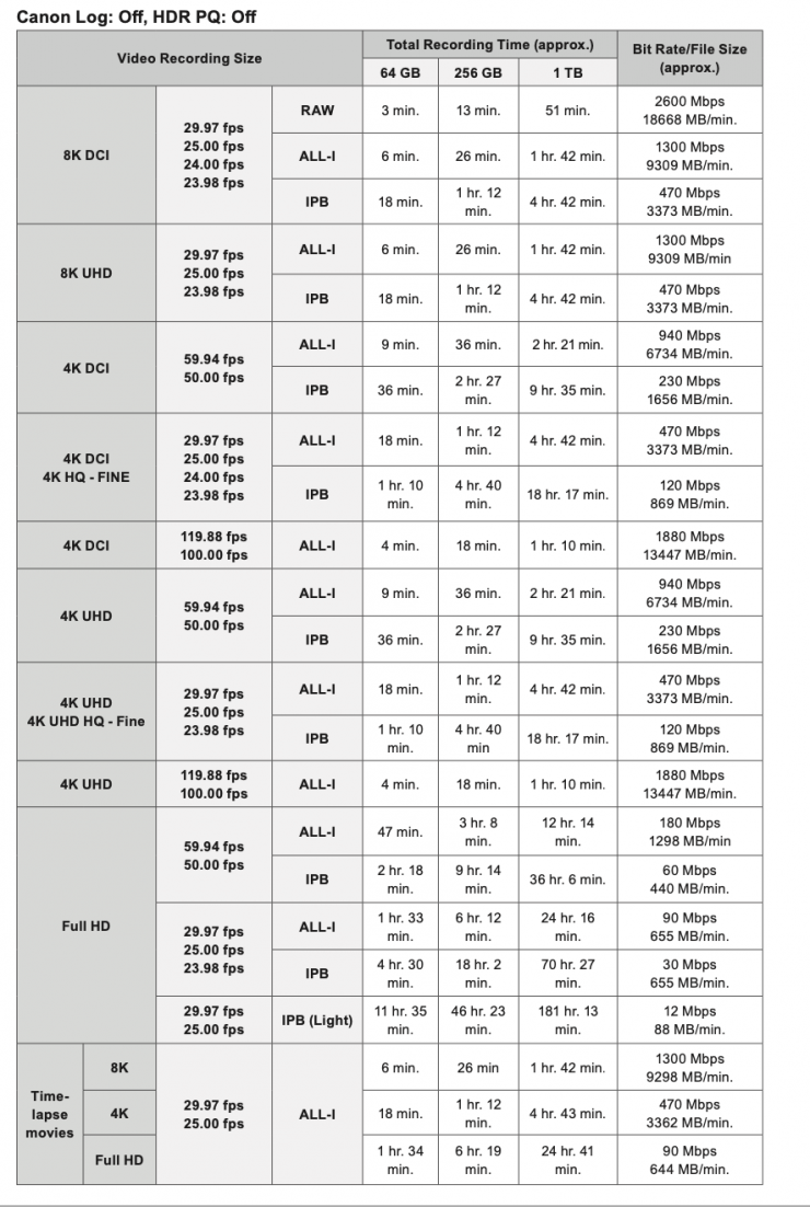 When shooting 8K DCI RAW you are looking at a data rate of 2600Mb/s. That is not a typo, it is 2600Mb/s. There is a recording limit of 20 minutes when shooting 8K DCI RAW. A 64GB CFexpress card will let you record 3 minutes of 8K DCI RAW. A 256GB card will let you record 13 minutes of 8K DCI RAW. Given the 20min record limit, you are going to need a lot of CFexpress cards if you plan on going down that route.