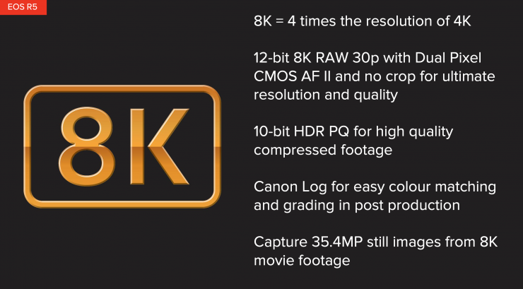 - 8K DCI and 8K video up to 30p in 4:2:2 10 bit Canon Log H.265 or 4:2:2 10 bit HDR PQ H.265
