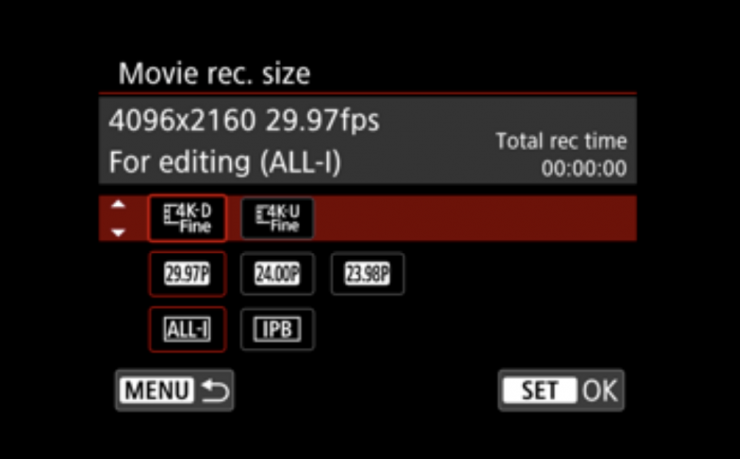 | 4K DCI | 4:2:2 10-bit | ALL-I/IPB H.264 | 23.98fps, 24fps, 25fps, 29.98fps, 50fps, 59.94fps, 100fps, and 119.98fps | 29.59min (4K DCI 120fps 5min) | |