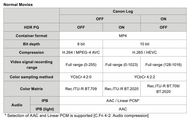 | Canon EOS R | UHD, HD (crop when shooting 4K) | 4:2:0 8-bit | 4K up to 30p HD up to 60p | No |