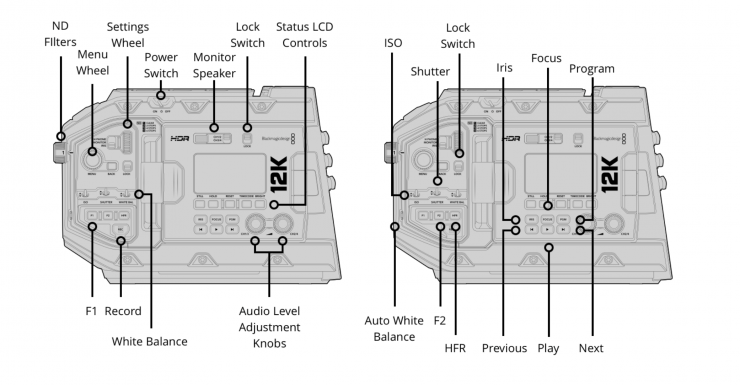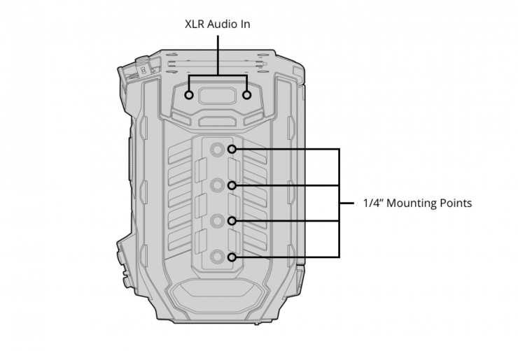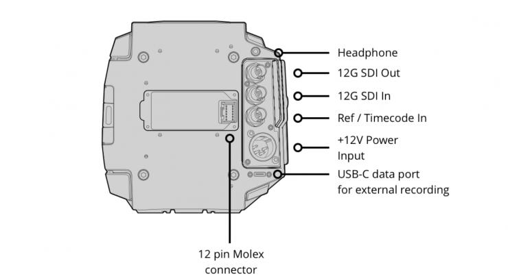 The URSA Mini Pro 12K features a magnesium alloy body. The magnesium alloy also makes it lightweight and helps to keep the camera cool by piping heat into an exchanger that allows convection cooling and heat dissipation from the camera’s body.