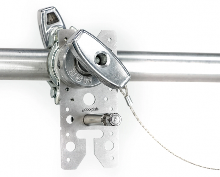 Gobo Plate is machined out of a single sheet of steel that’s about 1/8” thick. It measures 3”/76.2mm by 7”/177.8mm and weighs 8.15-oz/.23 kg. A center cutout allows pass-through of a 5/8-inch rod or baby pin while a variety of medium holes provide pass-through for a 3/8-inch bolt. Numerous small holes accommodate standard nail and screw diameters. At each end T-slots with V centering secure quick grip head mounting. There are also corner safety carabiner lanyard mounts to safeguard a grip head.