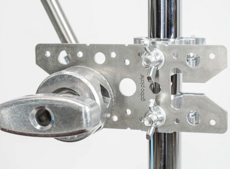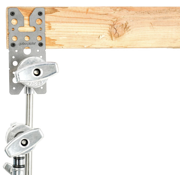 Gobo Plate was invented when professional photographer Mike Bradley occasionally needed an overhead beam in his studio. He didn’t want to invest in a truss so he struggled with placing a 2×4 on stands and used a multitude of grip gear to attach it. But he required crew for set up and even then, never felt it was safe. He solved the dilemma by designing a metal plate that would bolt or screw to the 2×4 and connect directly to a C-Stand.