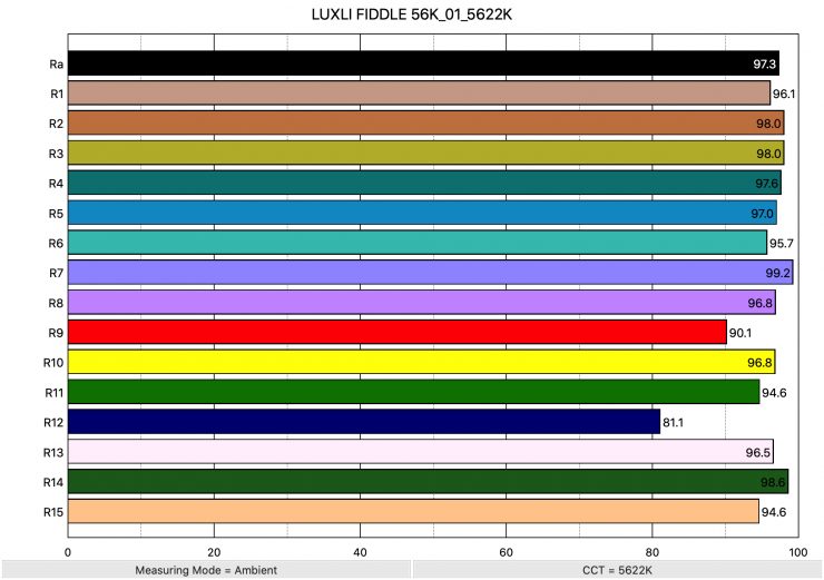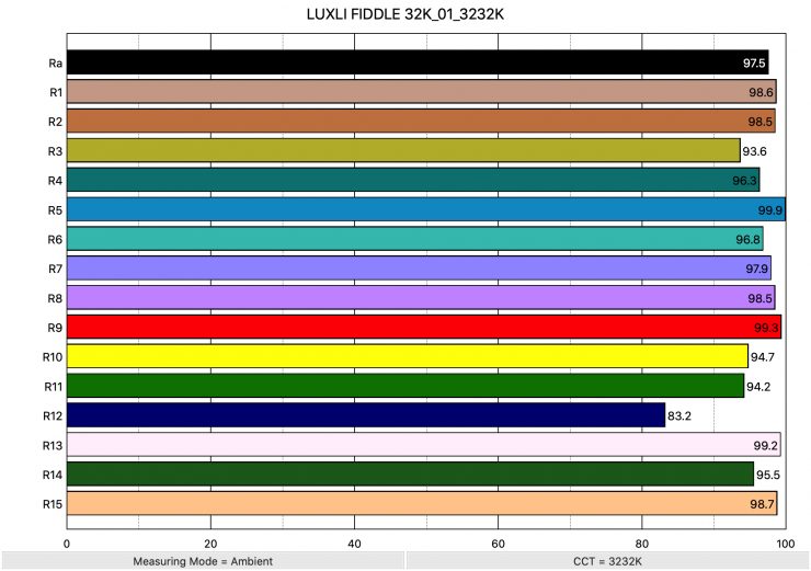 Above you can see the scores for when the light was used at 3200K. It recorded an average CRI (R1-R8) of 97.5 and an extended CRI (R1-R15) of 96.32. For replicating accurate skin tones it recorded 99.3 for R9 (red), 99.2 for R13 (closest to caucasian skin tones), and 98.7 for R15 (closest to Asian skin tones).