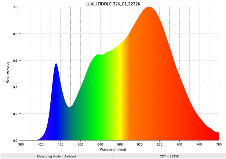 Above you can see the spectral distribution of the Fiddle when it is set at 3200K. The spectral distribution is nice and full and there is only a light push towards green.