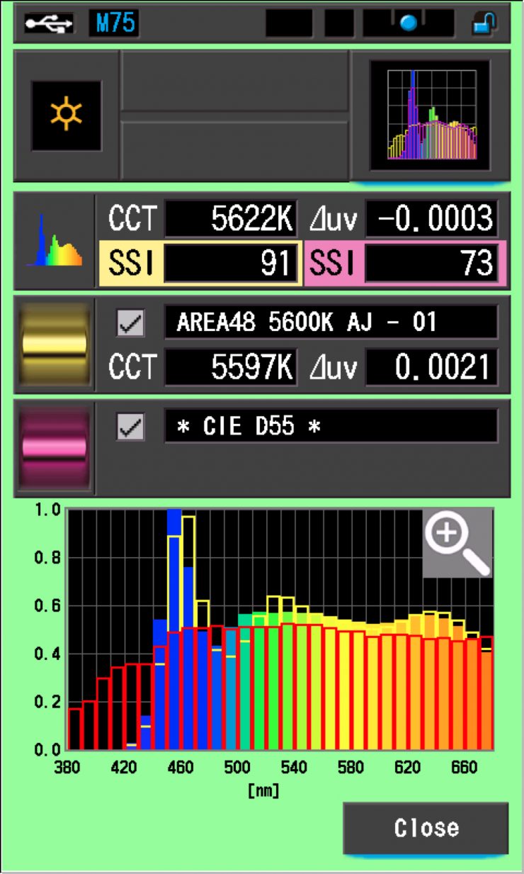 SSI (Spectral Similarity Index) was developed by the Sci-Tech Council of the Academy. SSI gives me the ability to set any light as a standard, or use predefined standards (such as CIE D55), and then give other lights an SSI score based upon how well they will match standards such as CIE D55. This way I can measure spectral response and compare it directly against an ideal light source. This is actually a much better test than recording CRI scores.