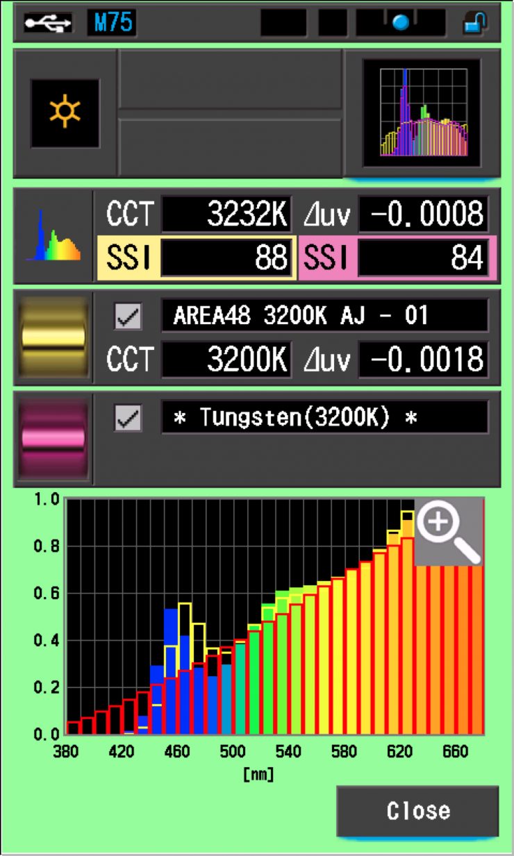 The main reason we want to record SSI scores is so we can see how well they match with other lights. As an example, let’s see how well it matches with a BB&S Area 48 Color. Above you can see the results at 3200K and 5600K. As you can see, the lights didn’t match. Although a low 90’s or high 80’s score, means they wouldn’t be drastically off.