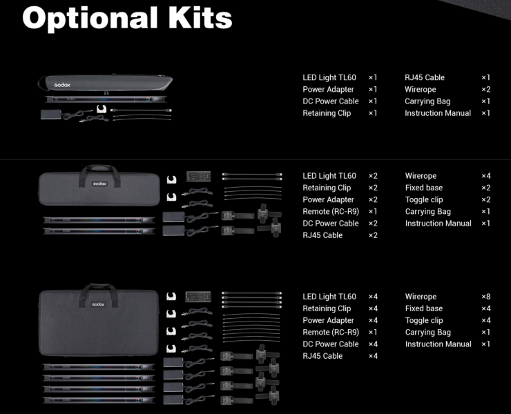 The Godox TL60 comes in 3 kits which contain either one, two, or four Godox TL60 LED lights.