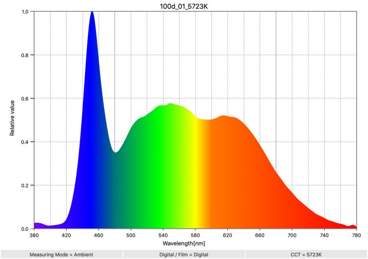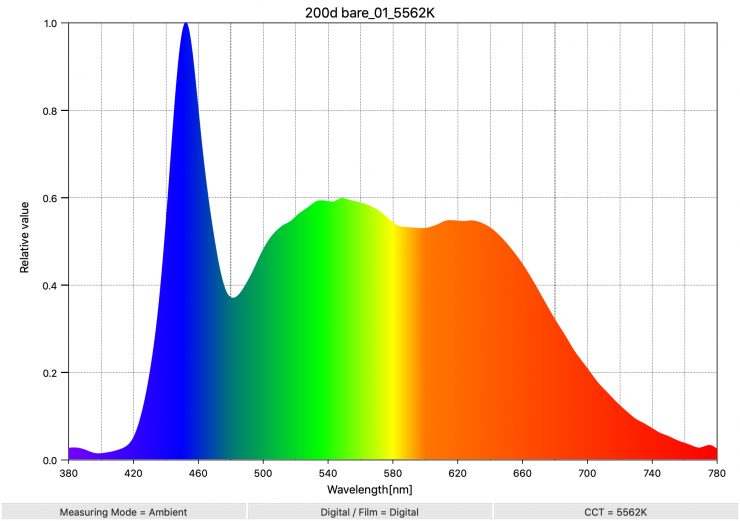 To test the color accuracy, I used a Sekonic C-700-U Spectrometer. The results are positive. Both fixtures are rated at 5600K, and they hit the mark very well. Let’s start with the 200d with and without the reflector.