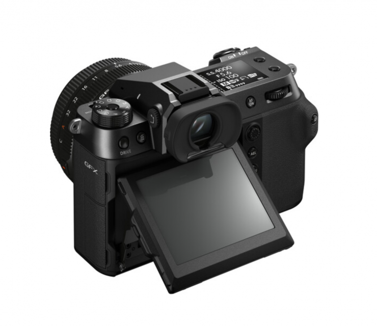 The GFX100S has a 3.2″ 2.36m-dot touchscreen LCD. This LCD features a unique three-way tilting design that moves both upward and downward for shooting from high and low angles, and also tilts to the side to benefit shooting in the vertical orientation when in live view.