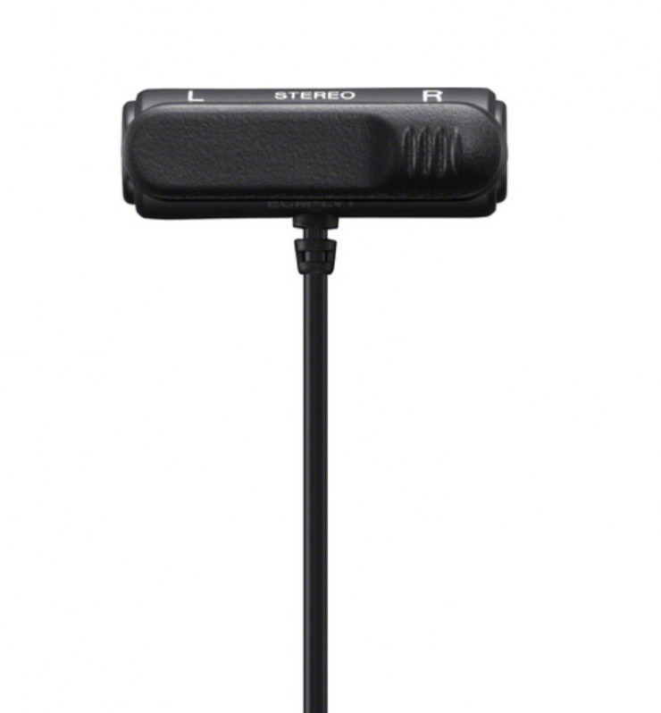 The ECM-LV1 compact stereo lavalier microphone includes a windscreen and a 360-degree rotatable clip. Power for the microphone is supplied via the mic connector.