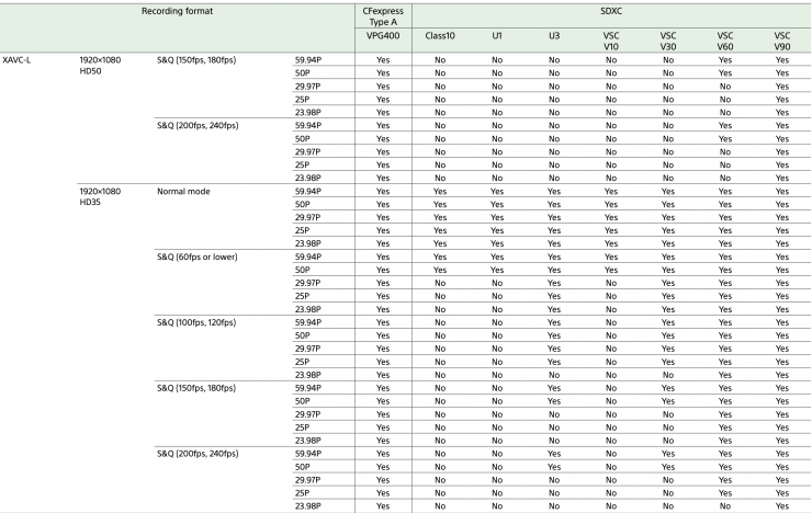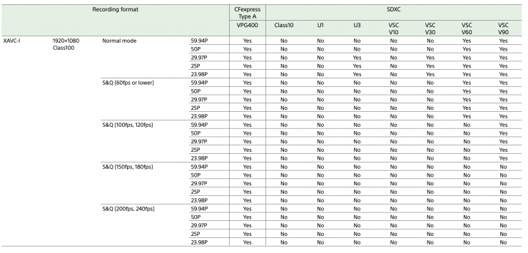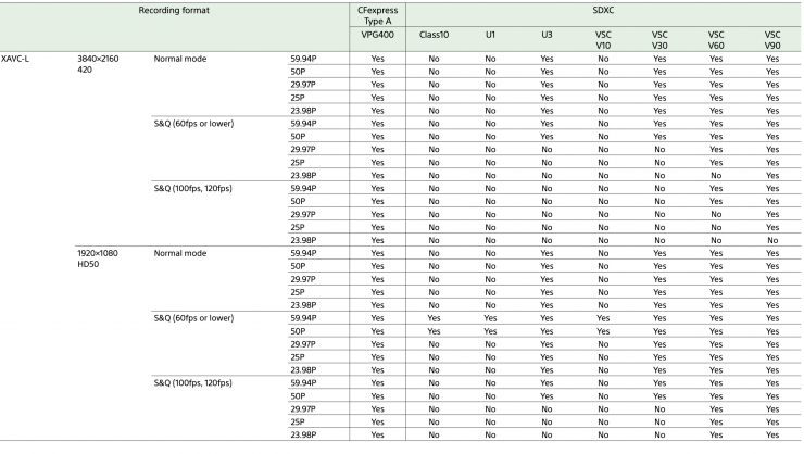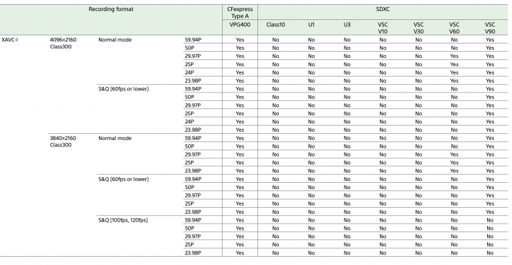 | Recording Modes | MPEG HD422/XAVC-I/4:2:2 10-Bit: 4096 x 2160p up to 60 fps 3840 x 2160p up to 120 fps 1920 x 1080p up to 240 fps |