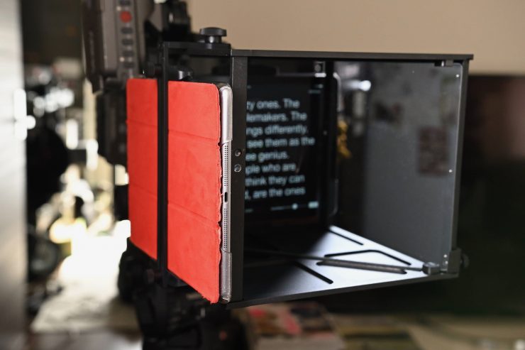 The autocue tablet holder works reasonably well, however, you need to be very aware of the size of tablet you can use. In this COVID-19 age, it is also nice that you can set up a Zoom call or similar and use the remote interviewers’ image so that the talent can look and speak directly to that person.