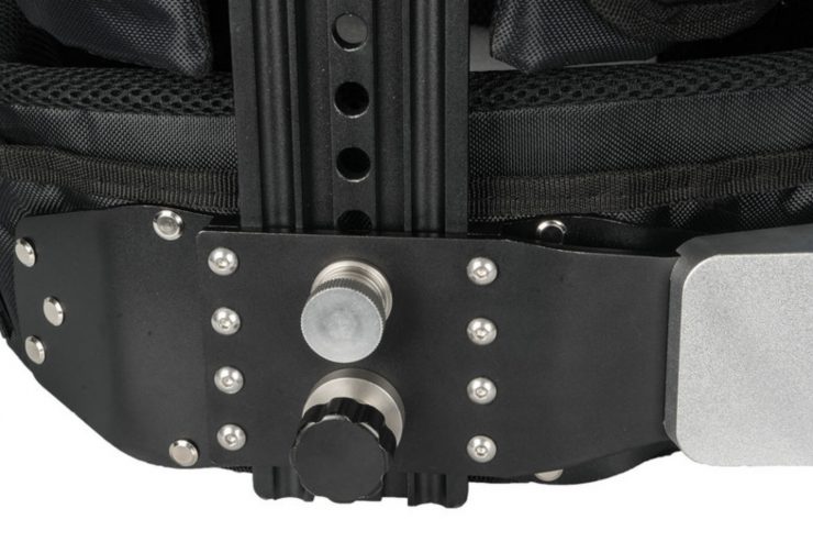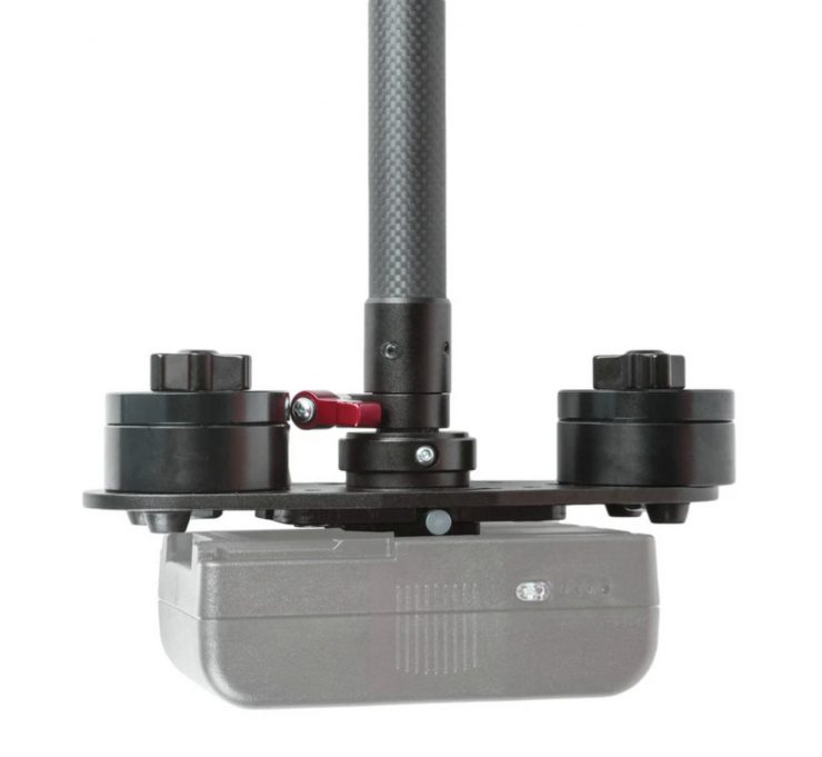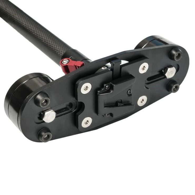 On the top of the stabilizer are 1/4″ and 3/8″ screws to mount your camera. On the bottom, there is a V-mount plate. Included are two 15mm diameter by 11cm long rods for attaching accessories such as a follow focus or matte box.