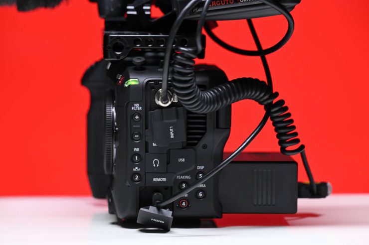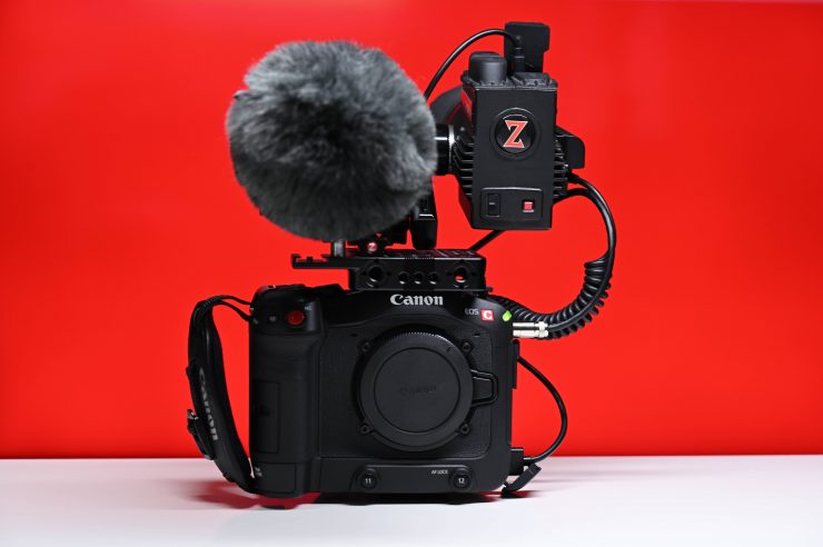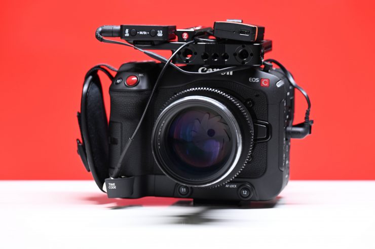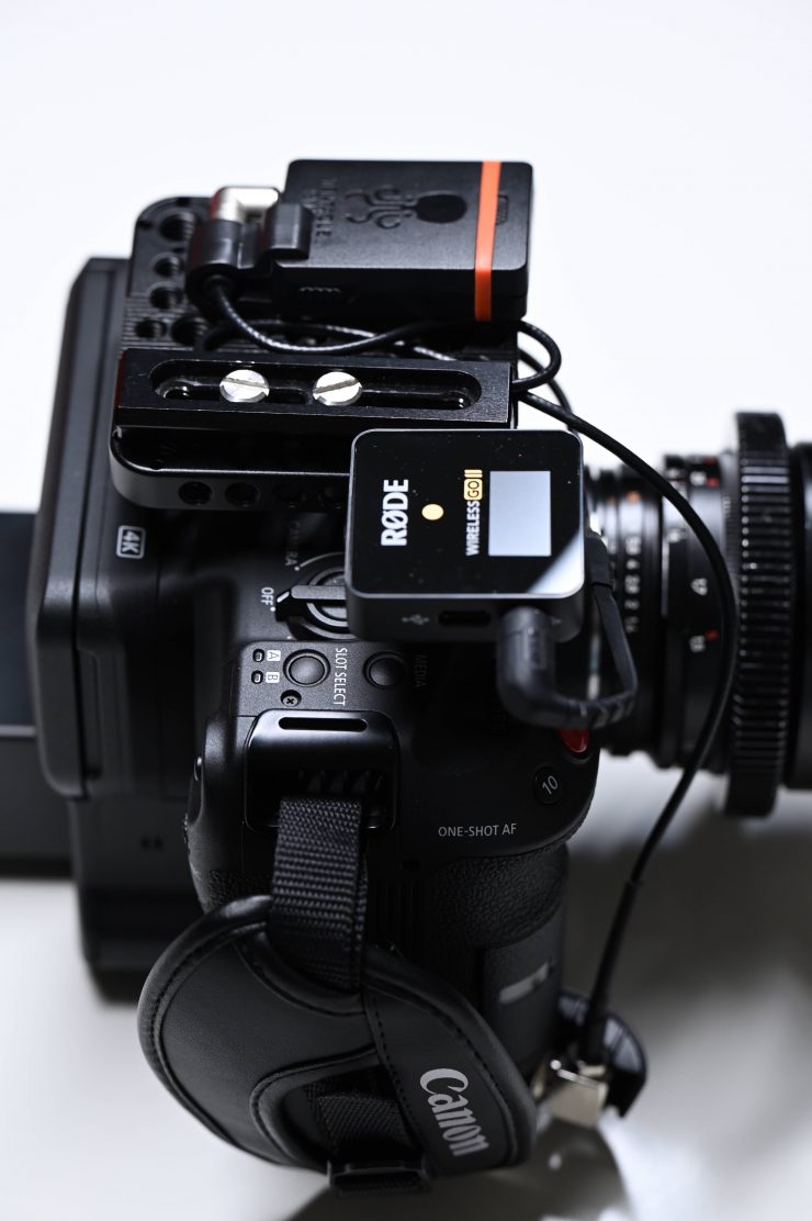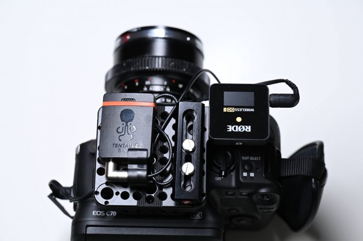 For the next setup and this is probably something that is more commonly what I would be using this particular camera for, I attached a Tentacle Sync E and a RODE Wireless GO II RX unit. As I primarily use the Canon C70 as a ‘B’ camera this configuration allows me to record time code synched footage and also receive a wireless reference track feed from the sound recordist. I could of course, also just use a different device provided by the sound recordist to receive audio and/or timecode.