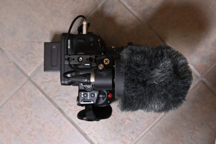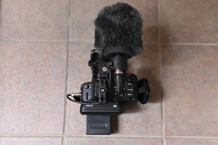 I could also use the Top Plate and then just attach the microphone mount that comes with the C70’s standard top handle. This is a quick and easy way of keeping the camera small, if you are working in environments where the back LCD screen is easy to see. It also allows you plenty of space to mount other accessories or even a monitor if need be.