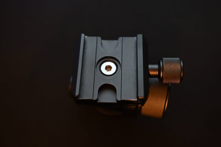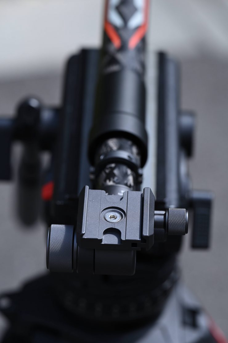 That mounting plate then slides onto the plate that is on the Slypod Pro’s pan & tilt head. You can also use a small-sized Arca Swiss quick release plates if you have one.