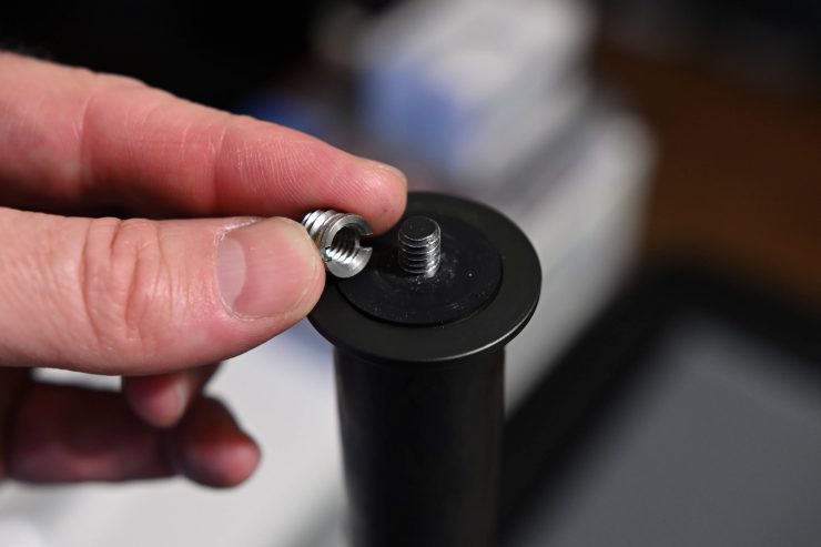 You need to attach the included mounting plate to a camera. The quick-release plate is supposed to come with 1/4” and 3/8” screws, but with the version I was testing there were no screws.