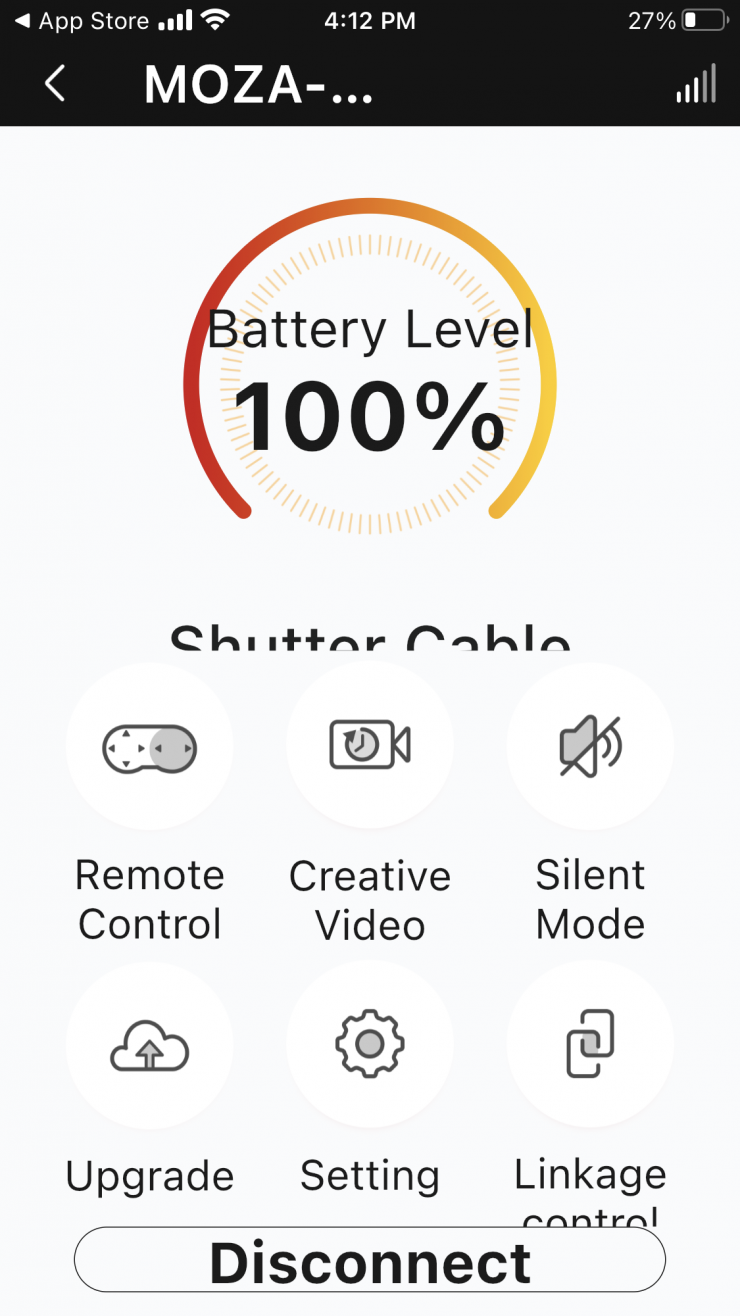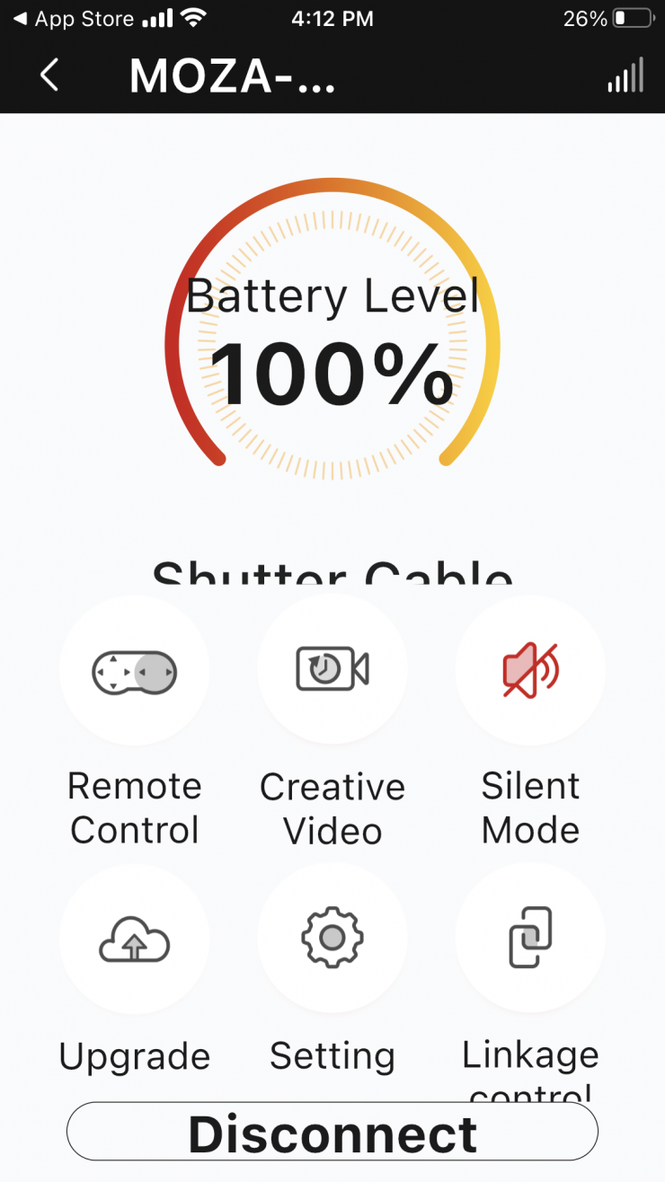 The app is pretty straightforward and easy to use. Once you turn on the Slypod Pro and launch the MOZA Master App you will see the device and you just hit connect. You are then greeted by the main menu.