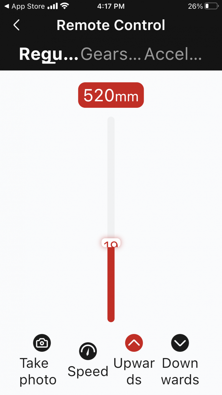 If you have the Silent Mode turned off, the Slypod Pro is really noisy if you just drag the sliders in the Remote Control mode. Dragging the sliders doesn’t seem to do anything even if you change the Speed. Even if you have the Speed set at 1 or 100 and you drag the sliders it still moves at the same speed. If you change the Speed I found that you had to physically press the Upwards or Downwards button for this to do anything.