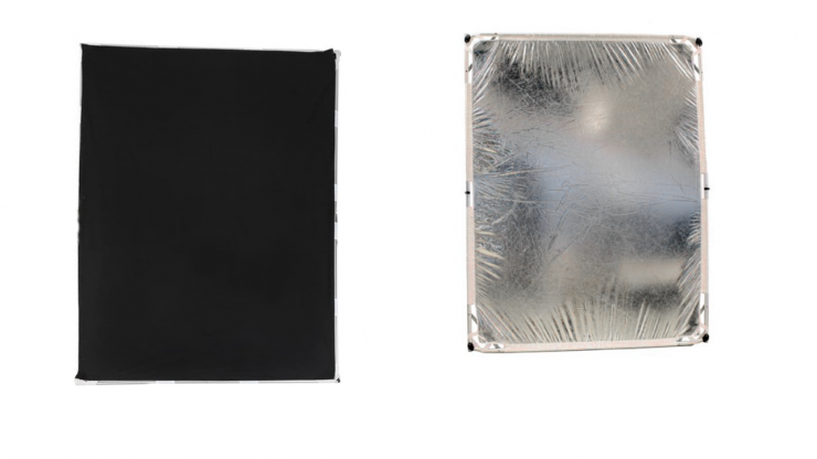 The FF-5×6.5 Black Negative Fill / Silver is designed so that users can set it up really quickly. Once the fabric is attached all you need to do is unfold the included metal frame and lock it in place. One side has Black Negative Fill to cut light or add contrast and the other side has a silver reflective material.