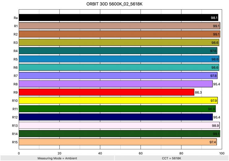 In the graph above the gold bars indicate a perfect CIE D55 source. The red bars indicate a perfect CIE D 5600K source. This lets us compare how close to a perfect 5600K lighting source the Orion 300 FS is. A score in the low 70’s is typical for a 5600K LED source.