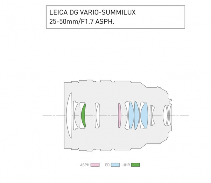 The optical construction of the 25-50mm F1.7 consists of 16 elements in 11 groups. The lens system features an aspherical lens and three ED (Extra-low Dispersion) lenses that are claimed to effectively suppress the axial chromatic aberration and chromatic aberration of magnification.