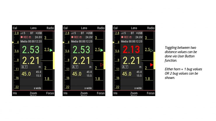 Hi-5 and the Radio Interface Adapter RIA-1 (and other devices as SUPs come that support this) will feature a new, bi-directional communication between the Cine RT and Hi-5 system. ARRI has developed this in a joint effort with Laird and Jon from Focusbug. The bi-directional communication allows for 2 distance values from Cine RT to be displayed on the Hi-5, as well as focus marks from the Cine RT hand set. In the other direction, you can setup the Cine RT Range Finder from the Hi-5 menu and user buttons, which is very useful. Additionally, the bi-directional protocol is fast, for minimal latency. The Focusbug integration will be available with RIA-1 a little after Hi-5 FCS.